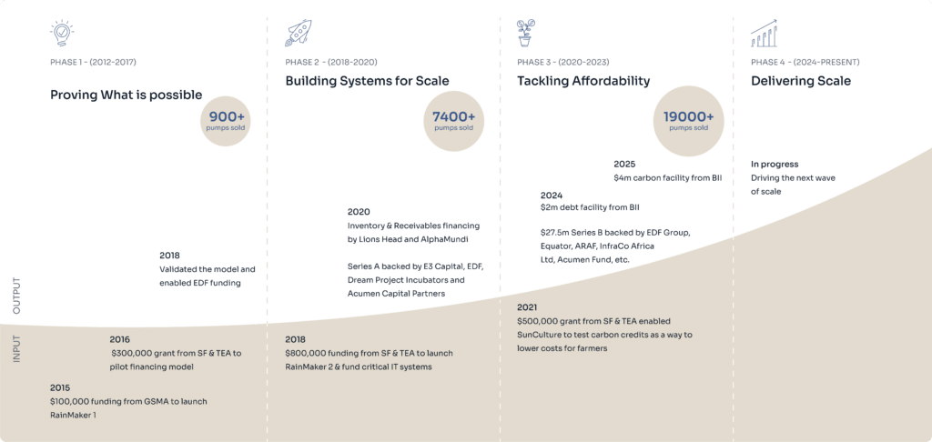 To overcome this, SunCulture needed to make the pump cheaper, create affordable financing options, and build the missing ecosystem from scratch. In 2015, a £100,000 grant from GSMA enabled SunCulture to design a more affordable pump — the RainMaker 1 — bringing the technology closer to farmers’ price points. This proof of concept attracted early equity from E3, Partners Group, Equator, and Angel Investors in 2017 to scale production.
