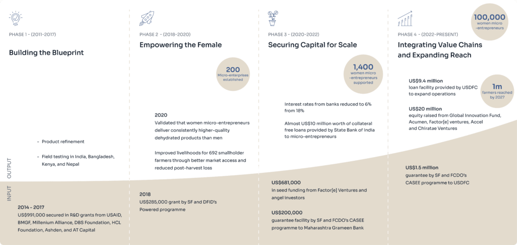 To improve the SCD’s design and test its applicability across contexts, S4S Technologies secured US$991,000 in R&D grants from USAID, BMGF, Millennium Alliance, DBS Foundation, HCL Foundation, Ashden, and AT Capital. These funds supported product refinement, field testing in India, Bangladesh, Kenya, and Nepal, and nutrition impact studies among women smallholders.